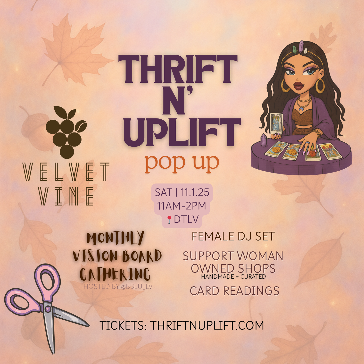Join us for a dreamy gathering at Velvet Vine Wine in DTLV as @BBLU_LV presents the next Thrift N’ Uplift Pop-Up, an immersive gathering designed to inspire your next glow-up!
